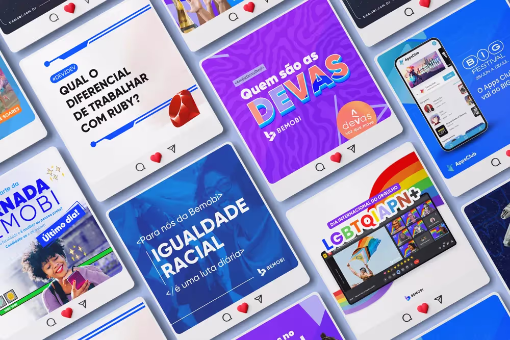 Para isso, mergulhamos no universo e na cultura da empresa, desenvolvendo uma estratégia de comunicação integrada e consistente. Preparamos um enxoval de marca completo para apresentar a Bemobi como uma empresa atraente para futuros talentos, destacando seus valores, visão e missão.