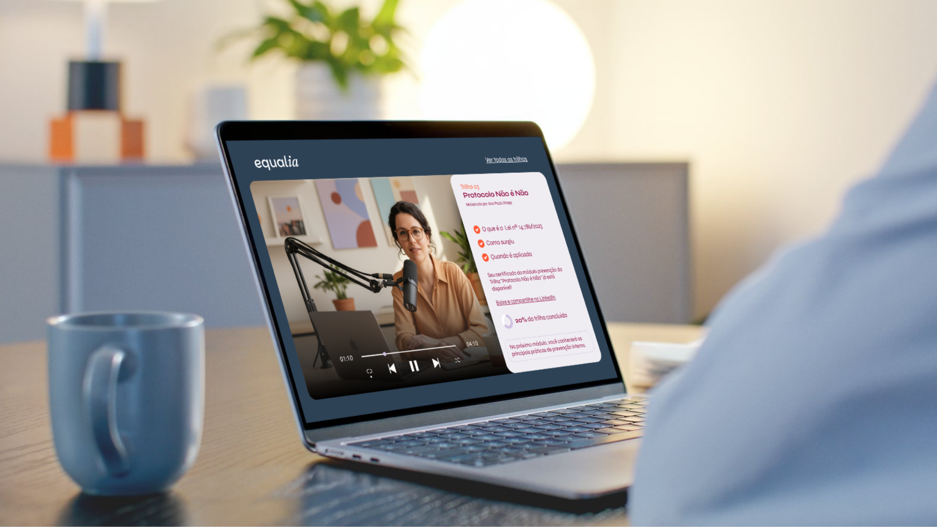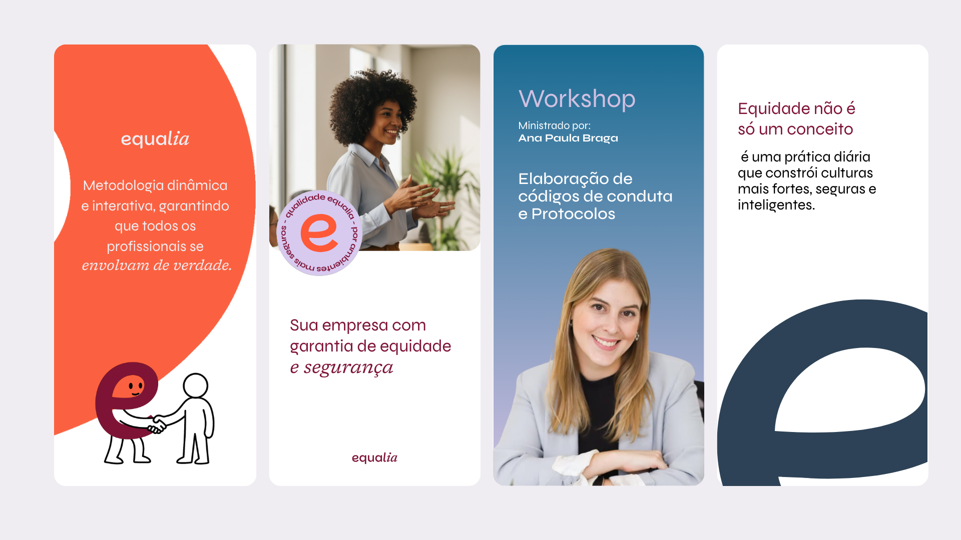 Estruturamos todo o posicionamento da marca e a forma como ele seria transmitido ao mundo. Isso inclui desde a escolha das cores, tipografia e elementos visuais até a definição da linguagem, do tom de voz e da presença digital. Também desenvolvemos selos de certificação que serão aplicados quando os treinamentos e a implementação de compliance de gênero forem realizados. Todas as organizações poderão ser certificadas com o selo Equalia, que já está preparado para ser porta-voz de ambientes que prezam pela equidade e por espaços seguros. Com um time predominantemente feminino, a Outlab se orgulha de ter feito parte de uma iniciativa que luta por uma realidade mais justa e segura para mulheres e minorias sociais.